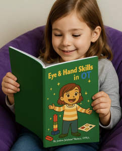 After exploring hand skills, big body movements, and brain-body connections in the first four books, I wanted to focus on another exciting area: eye-hand coordination. That’s what inspired Eye and Hand Skills in OT, the fifth book in my “What Is OT?” series. This story helps children and families understand how their eyes, hands, and brain work together to explore, play, learn, and complete everyday tasks.